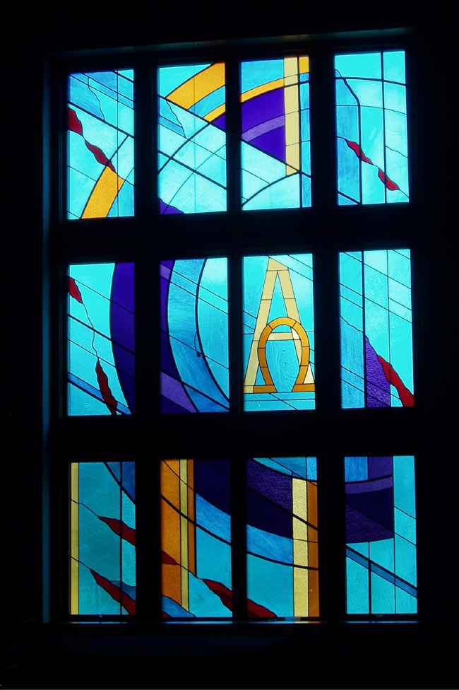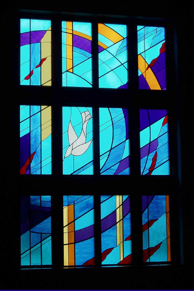 These windows flanking the altar area left and right lend rounded lines to a building otherwise squarish in many ways. The downward sloping lines direct focus to the altar area. See below for more detail of the windows. Excerpt from Hilltop United Methodist Church: "I am happy to recommend O'Brien stained glass company. They certainly considered our needs and desires, making creative suggestions but not trying to dictate to us what kind of windows we should purchase from them. They provided drawings and samples that enabled us to let the congregation know both the process and what the end result would be like. The work was accomplished sooner than I expected and with consideration for the schedule of the church. The workmanship was excellent and I have heard nothing but positive comments about the improved worship atmosphere in our sanctuary after the windows were installed. I would be happy to show the windows to any one who wants to view them." Marlowe D. Potter, Pastor