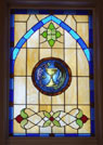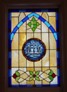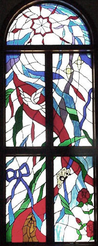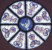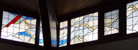 The first panels were very much like the older panels where they met near a support beam at the center of the nave. The window design is repeated on each side of the church until the design meets and culminates in the sunburst which means Easter and resurrection to them.